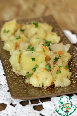 написано, только потом зажариваем лук репчатый, когда готов-добавляем туда немного муки, дожариваем, а потом разводим с квородке водой, прибавляем сахарку, лавровый лист - потом все это в картошку с капустой, мешаем и еще немного тушим. Получается тоже объедение!
