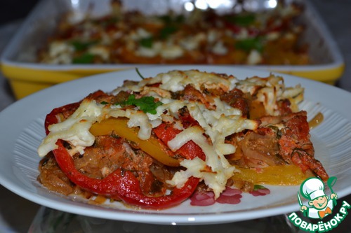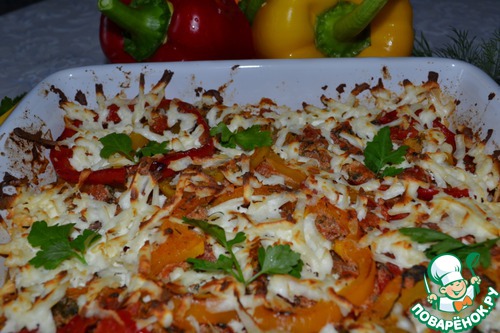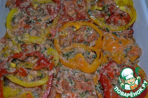 Полученный соус выливаем в форму для запекания. Стараемся, чтобы наши перчики оказались вверху. Подправляем.