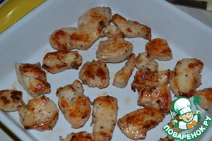В сковороде на смеси растительного и сливочного масла обжарить порезанное филе до золотистой корочки. Выложить в форму для запекания