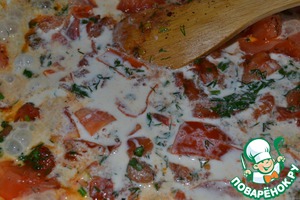 Обжарить чеснок, добавить порезанные кубиками помидоры, порезанную зелень, соль, перец, мускатный орех, ваши любимые специи. Перемешать. Потушить 2-4 мин. Вылить сливки. Потушить еще минуты 3.