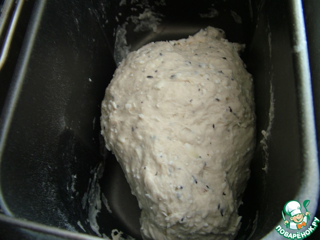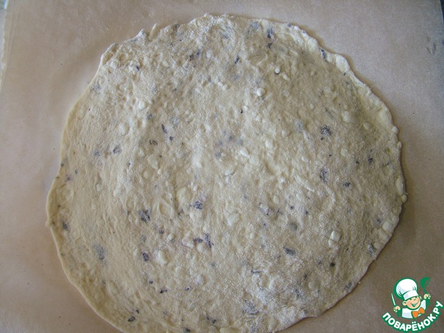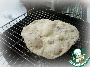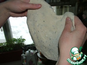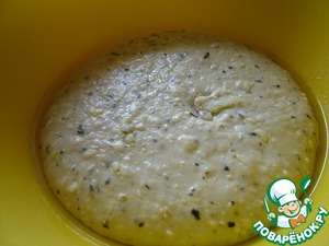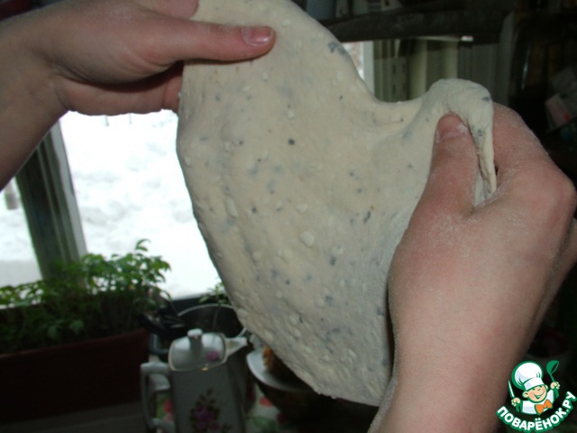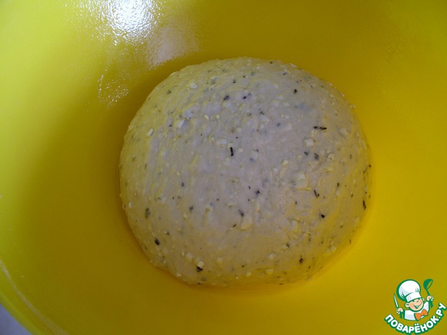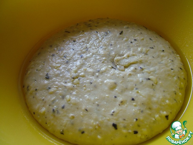 Замесите тесто из опары, муки, соли и оливкового масла. В конце замеса добавьте сыр с травами. Тесто должно получиться довольно плотным, так как мы будет его раскатывать в лепешки.