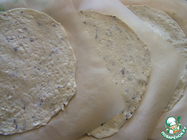 Хорошенько присыпайте лепешки мукой и прокладывайте листами пергамента