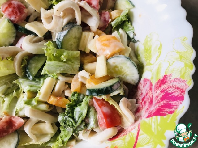 Вкусный салатик придется по душе всем, кто любит кальмаров и свежие овощи:)