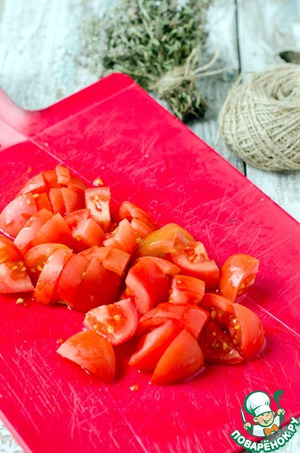 В сковороде разогреть растительное масло. Всыпать лук и морковь, немного поджарить, затем всыпать помидоры и красный перец. Посолить, добавить травы и соевый соус.