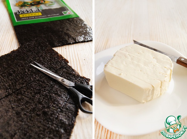 Сыр здесь играет роль рыбного филе, так что главное, чтобы он не плавился при воздействии температуры, а сохранял рыхлую текстуру, а за вкус и запах ответственны водоросли, так что, я полагаю, должно получиться