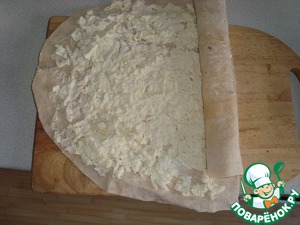 На вторую часть намазываем яичную начинку, в начало листа кладем сырный рулет и сворачиваем все вместе