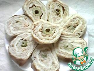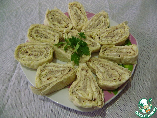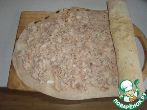 На целый лист лаваша намазываем рыбную начинку и также кладем рулет в начало листа и сворачиваем