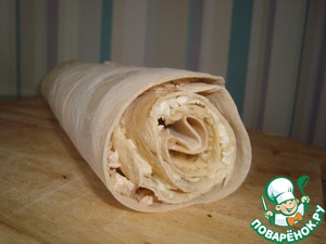 Берем лист лаваша и разрезаем его так, чтобы одна часть получилась немного больше второй. На меньшую часть намазываем сырную начинку и сворачиваем в рулет