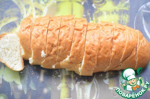 Багет нарезать ломтиками толщиной 5-7 мм. (я использовала батон)