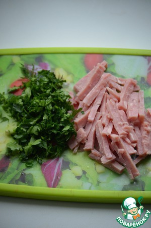 Добавить ветчину и зелень, посолить, поперчить по вкусу.