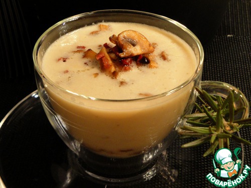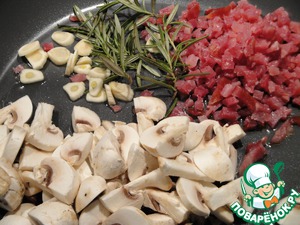 Пока варится наш суп, то мы приготовим грибы. Для этого бекон, шампиньоны и чеснок порезать. Если вы не совсем переносите чеснок, то удалите у него сердцевину. Для розмарина предлагаю два варианта: для тех кто его обожает- иголочки нарезать меленько а для тех кто к нему относится с осторожностью- оставьте веточки целыми, что-бы потом их удалить.