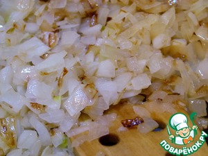 Нарезать мелко лук (это легко - глаза то ненакрашенные)), обжарить до золотистого цвета.