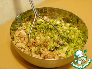 Смешать жареный лук и сваренный зеленый горох, хорошо размять.