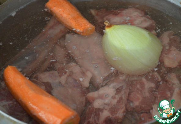 Мясо должно очень хорошо провариться, так чтобы отходило от кости. Отварить 4 часа. Нужно часто снимать пенку, чтобы бульон получился прозрачным. Варить необходимо минимум три часа. В бульон при варке я добавляю луковицу и морковь для аромата и прозрачности бульона.
