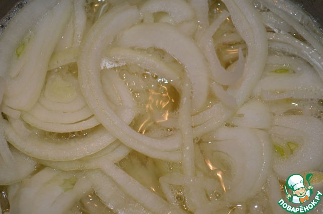 За приготовление лука беремся после того, как сварилось мясо и процежен бульон. В сотейник выкладываем нашинкованный полукольцами лук. Заливаем его бульоном так, чтобы бульон слегка покрывал слой лука. Солим и доводим до кипения. После кипения варим 10 минут.