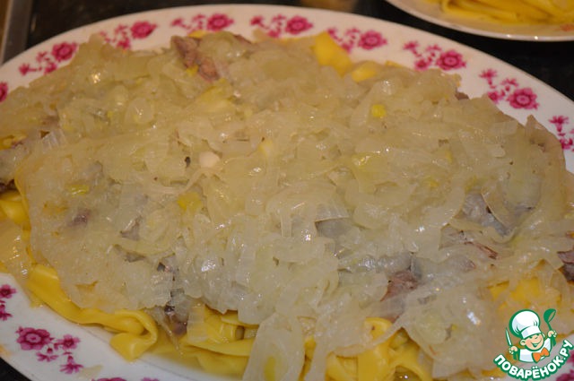 Во время варки теста поставьте подогревать мясо, картофель и лук. К окончанию варки теста у вас будут горячими все компоненты. На выложенное тесто выкладываем слой мяса без бульона.
