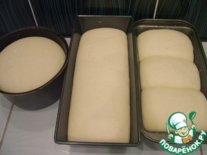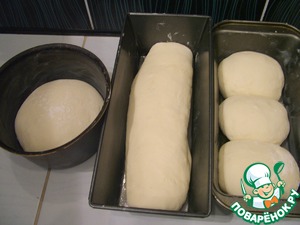 Из этого количества теста я делаю три средних хлеба: простой, круглый (в форме для кулича) и сайку (в форме для кекса). Никак я не раздобудусь профессиональными формами для хлеба, но меня пока и так устраивает, к тому же мне мой хлеб нравится и я не стремлюсь к тому, чтобы он был идентичен магазинному во всех отношениях )))
