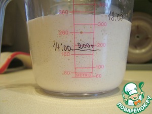 Это очень жидкая опара, поэтому она будет бродить сама в себе и практически не поднимется. На поверхности опары будет симпатичная пенная шапочка, ну и запах конечно кисловато-фруктовый. Не передерживайте опару больше 12 часов, а то хлеб будет сильно кислить. В принципе, если не хотите оставлять опару на ночь, то достаточно и 4 часов, но при более высокой температуре - 23-25С!