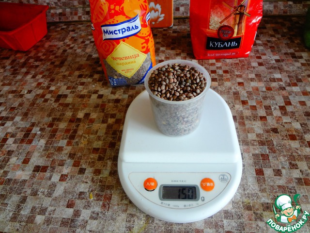 Взвесить чечевицу компании "Мистраль". Промойте и варите минут 35, чтобы она хорошо сварилась до мягкости.