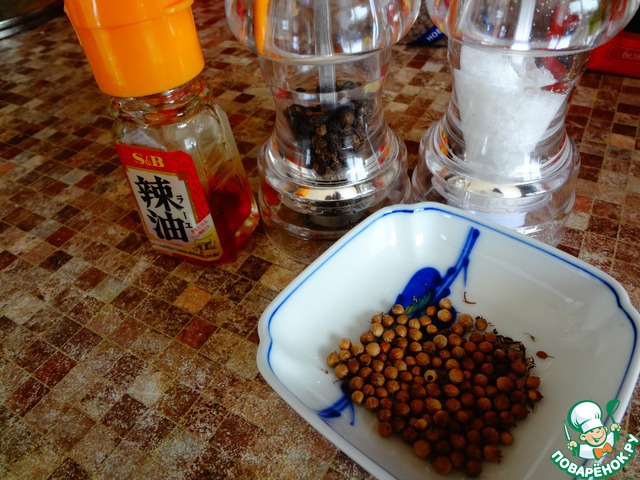 В сварившуюся чечевицу положим по вкусу свежемолотый чёрный перец, морская соль из мельницы, молотый кориандр. Мне пришлось перемолоть в кофеварке и просеять через сито. Я ещё добавила для остроты несколько капель масляного перца чили. Перемешать.