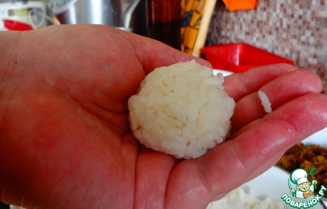 Приготовить ёмкость с водой. Там мы будем мочить руки, чтобы рис не приставал к рукам. Скатать шарик из риса, плотно его прижимая.