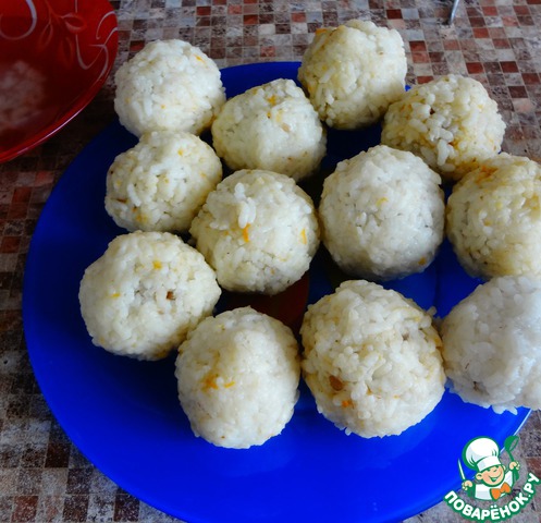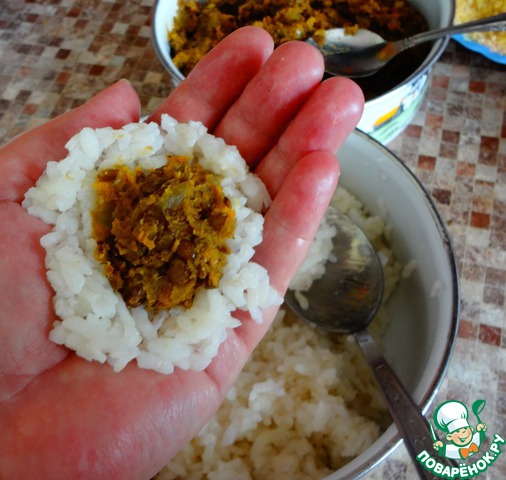 Обжать рис вокруг начинки, чтобы получился шарик. Не переживайте, если вы не рассчитали и риса у вас не хватило, чтобы прикрыть чечевицу. Возьмите из тарелки и залепите то место, где видна начинка. У вас должны получиться вот такие шарики.