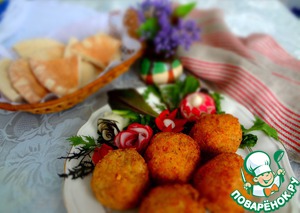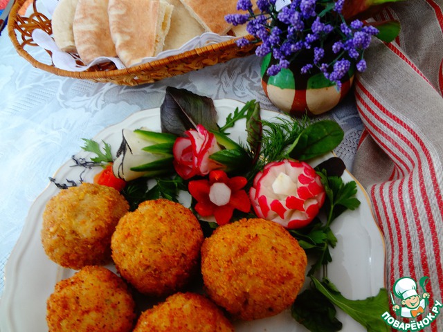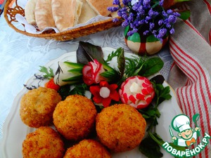 Можете начинать сервировать. Для этого можете вырезать красивые цветочки из свежих овощей, которые потом можно будет съесть. А шарики в миндальной панировке получились очень душевные, вкусные и хрустящие.