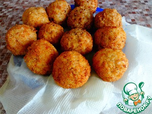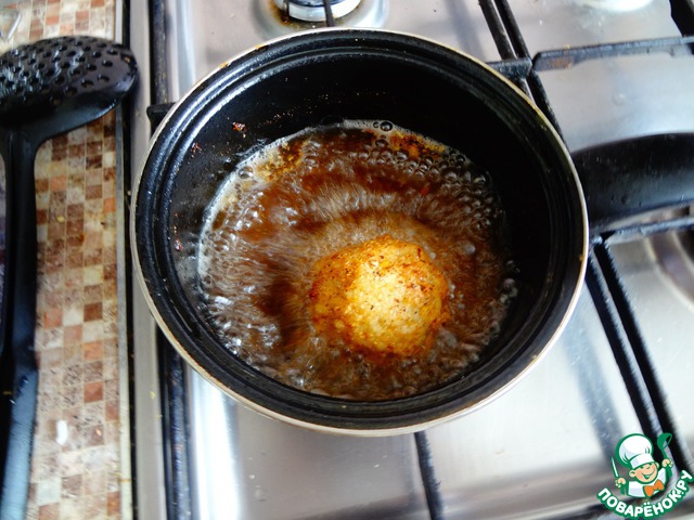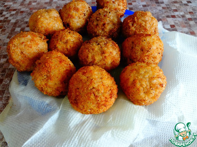 Наши рисовые шарики будем жарить во фритюре. Поэтому возьмите подходящую посуду, налейте масло и поставьте на огонь разогреваться. Раскалите до "белого дымка", уменьшите огонь и начинайте жарить. Каждый шарик нужно снова намочить мокрыми руками (обычно я это делаю во взбитом белке), обвалять в панировке и жарить в масле с двух сторон, постоянно переворачивая, чтобы они обжарились равномерно. Если заметите, что к шарикам стали приставать горелые крошки, не поленитесь, процедите масло, снова разогрейте и продолжайте жарить до конца.
