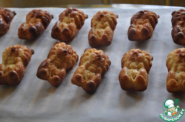 • Ставим в разогретую духовку. При 220 С на 4 мин, а потом снижаем температуру до 180 С и держим еще 10 мин. Вынимаем из духовки. Даем постоять 3-5 мин, вынимаем из формы и раскладываем на бумагу.