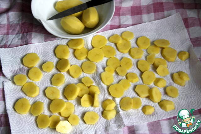 • Картофель очистить, помыть, нарезать кружочками и выложить на салфетки и промокнуть сверху, чтобы убрать лишнюю влагу.