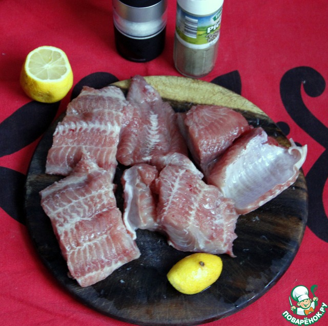 • Филе рыбы ( у меня - сом) нарезать порционно, посолить и поперчить белым молотым перцем.