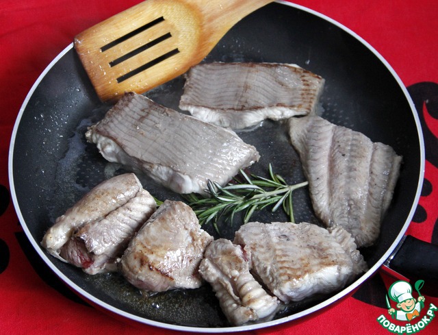 • Разогреть сковороду, влить 2 ст. л. оливкового масла, добавить веточку розмарина, нагреть, чтобы пошёл запах от него и обжарить филе рыбы с обеих сторон.