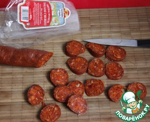 • Нарезать кружочками салями с паприкой.