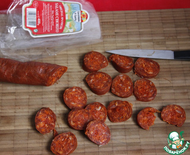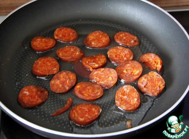 ***Обжарить на сковороде (можно добавить ещё 1 ст. л. оливкового масла) салями чоризо по 1 мин. с каждой стороны.