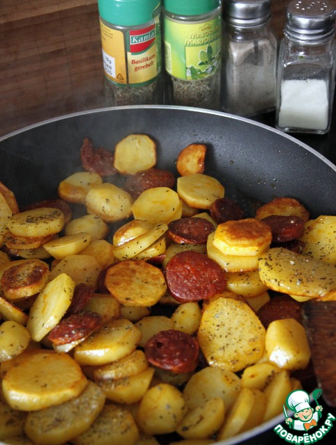 • Приправить сушеным майораном и базиликом, солью, чёрным молотым перцем, довести картофель до готовности (возможно, понадобится ещё 5 мин.)
