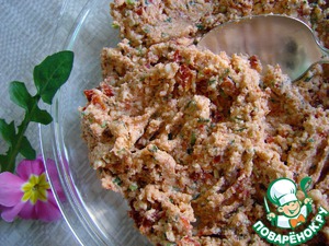 Затем так же мелко порезала вяленые томаты, их тоже добавила к сыру Томаты у меня были собственного приготовления, расшифровываю, что указано в ингредиентах : я взяла двенадцать половинок. т. е. получается шесть помидоров, каждая половинка размером приблизительно с десертную ложку, чуть меньше - чуть больше. В общем, если решите приготовить эту пасту, количество томатов выбирайте, ориентируясь на собственный вкус, я добавляла по чуть-чуть, пока не остановилась на том, что мне понравилось