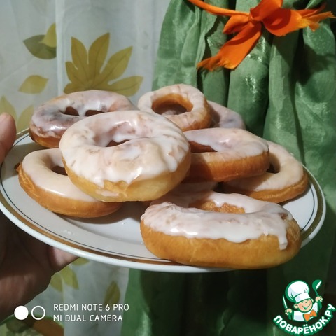 На глаз всыпала сах. пудры, добавила немного водички и лимонного сока. В эту смесь погружаю пончик. -