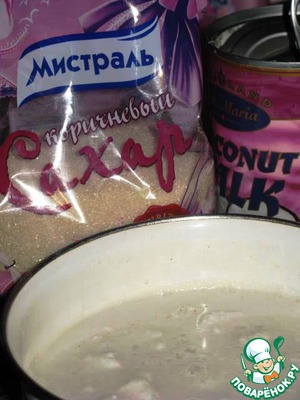 300 мл кокосового или соевого молока довести до кипения вместе с сахаром.