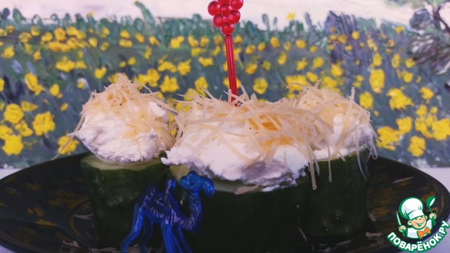 Огурец разрезать на 3 столбика, по бокам срезать кожицу "частоколом". Шарик положить на столбик и зафиксировать шпажкой.