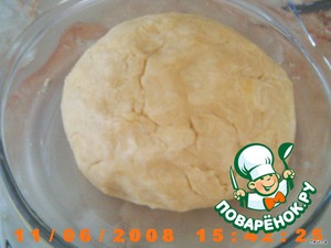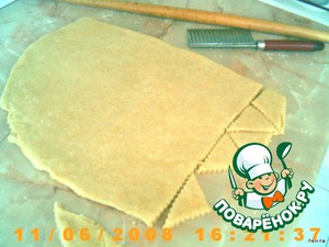 Тонко раскатываем тесто (толщиной 2 мм), смазываем слоем начинки. Складываем его как слоеное тесто: раскатываем, кладём начинку на одну сторону, накрываем другой стороной теста (той, что без начинки), раскатываем. Повторяем этот процесс. Так со всеми 4 частями начинки.