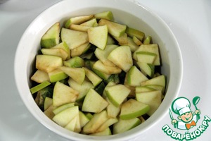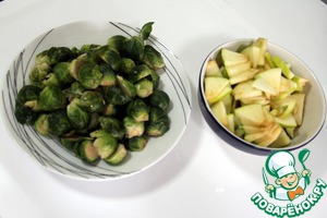 Кочанчики брюссельской капусты моем и режем пополам. Яблоко нарезаем на небольшие ломтики.