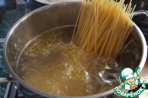 Спагетти сварить в большом количестве воды с добавлением соли и оливкового масла "аль денте", откинуть на дуршлаг, а затем вернуть в кастрюлю.