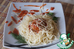 При подаче на тарелку выложить пасту в виде "гнезда", в середину налить пару столовых ложек соуса, сверху уложить шарик и посыпать все тертым пармезаном.