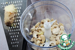 Кешью насыпать в чашу блендера, добавить немного натёртого имбиря. -