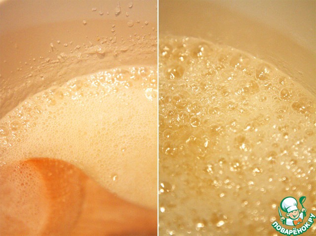 • Далее добавляем в сироп лимонный сок, перемешиваем и продолжаем уваривать. Увариваем приблизительно до 115 градусов или до "пробы на мягкий шарик" - для этого зачерпните чайной ложкой немного сиропа, опустите в холодную воду, после чего попробуйте скатать шарик. Во время пробы - кастрюлю с огня снимайте, чтобы не переварить сироп. Время варки примерно 3 - 5 минут.