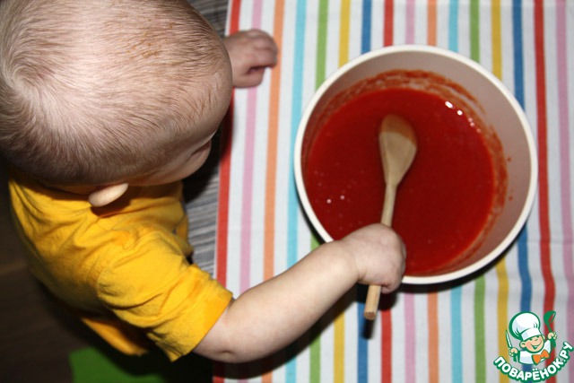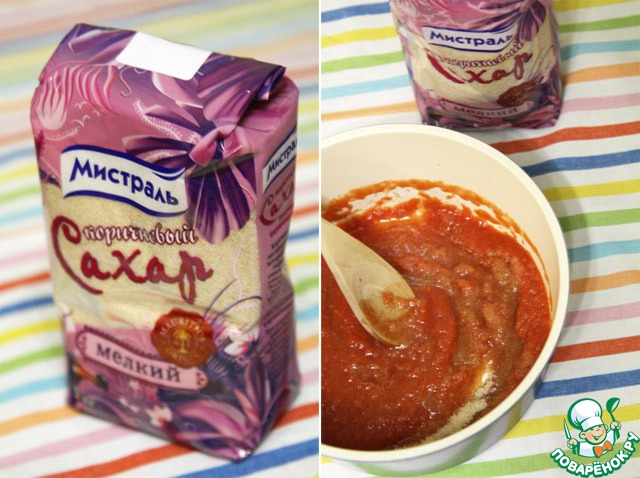 Смешаем томатный сок (или разбавленную томатную пасту) с сахаром.
