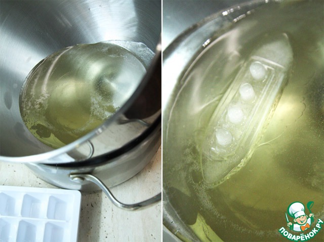 • Далее необходимо сироп охладить до 40 градусов и хорошо взбить. Я делала это в глубокой чаше от стационарного миксера - не повторяйте моих ошибок. Взбивать нужно в широкой плоской ёмкости, лучше всего крюками для теста. На фото показано, как я выходила из ситуации: налила в кастрюлю воду со льдом, поставила в нее емкость для взбивания, перелила туда сироп, сверху так же уложила кусочки льда. Это вообще "шик"! В идеале лед совсем растает, и его легко можно будет слить. На практике - в глубокой емкости это все очень неудобно и не очень получается)))