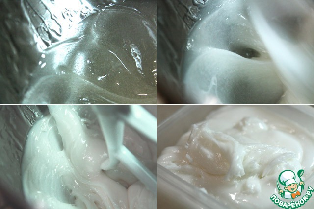 • После того, как сироп остынет - его необходимо взбить. Взбивать его достаточно долго, от 10 до 30 минут, в зависимости от правильности приготовления сиропа и мощности миксера. На фото видно, как сироп постепенно мутнеет, светлеет, и в конце он должен резко побелеть и очень сильно загустеть, так что его можно будет собрать в комок. У меня в этот раз получилось не идеально - то ли не доварила сироп, то ли вода осталась от льда в сиропе... Но даже в таком виде это очень вкусно! В дальнейшем помаду хранят в холодильнике, а перед использованием подогревают в микроволновой печи или на водяной бане.