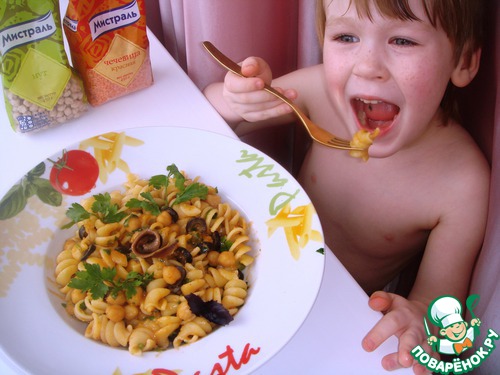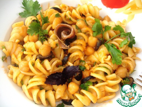 Рецепт «Фузилли с нутом, маслинами и соусом из красной чечевицы и каперсов»: