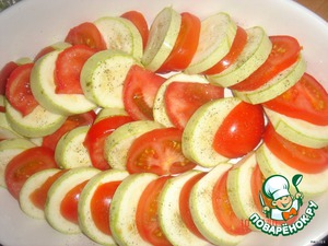 Кабачки и помидоры режем кружочками, выкладываем веером в смазанную растительным маслом форму для запекания. Солим, перчим.